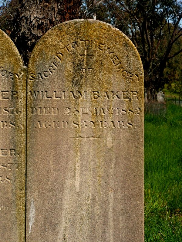 A close view of the inscription on the gravestone for William Baker in Jumpers Flat Cemetery