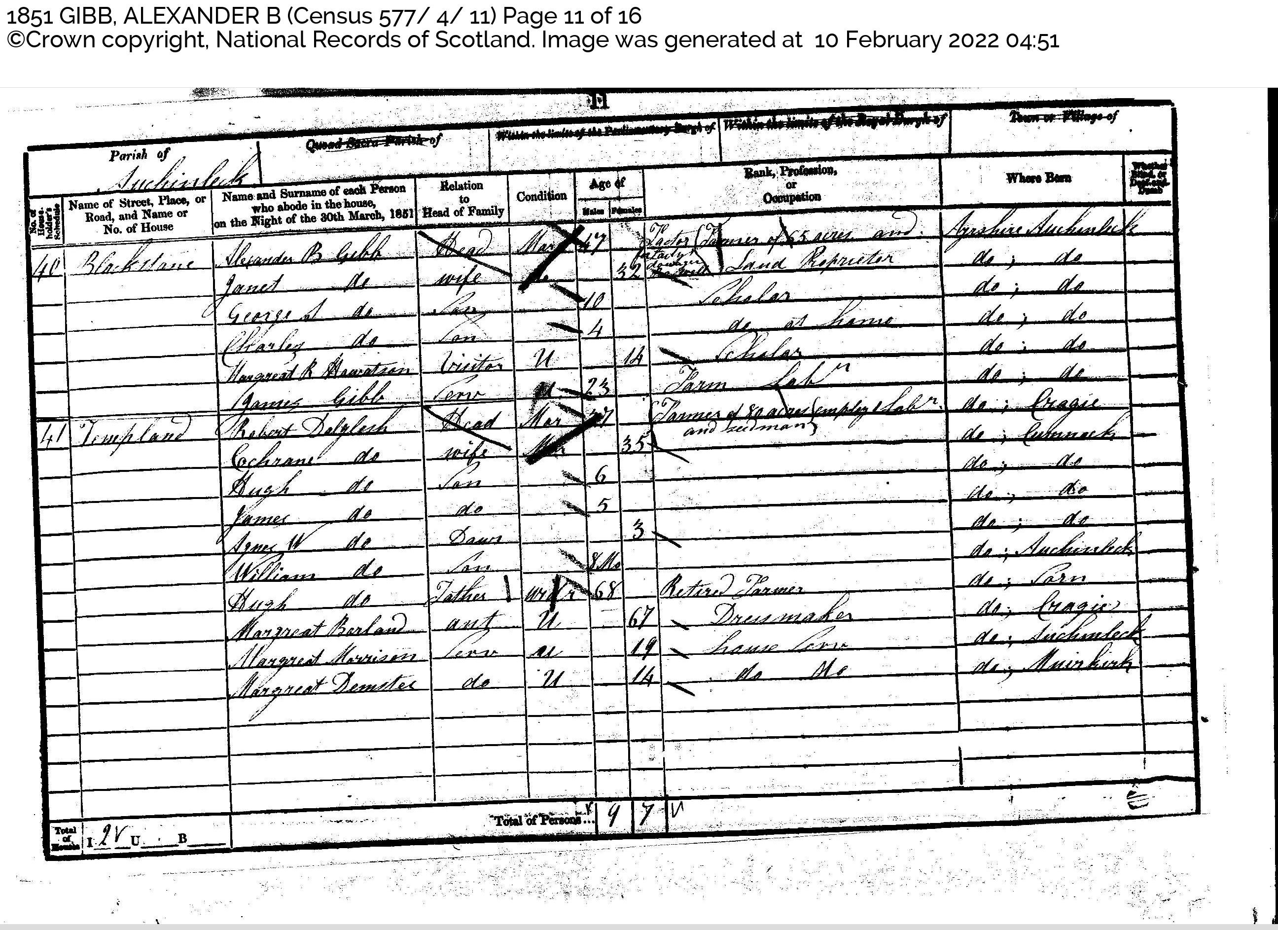 Household of Alexander Gibb at Auchinleck, Ayrshire, Scotland on the 1851 census