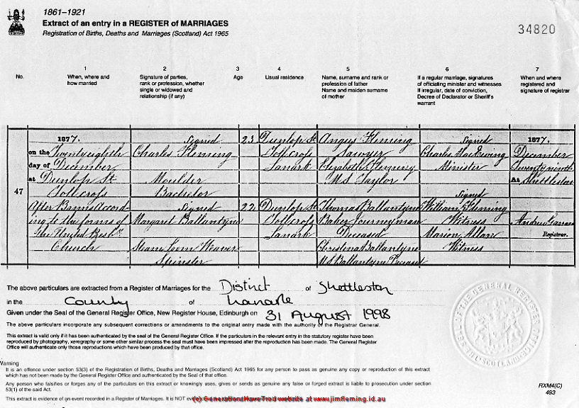 Fleming-Ballentyne Marriage Certificate, 28 Dec 1877