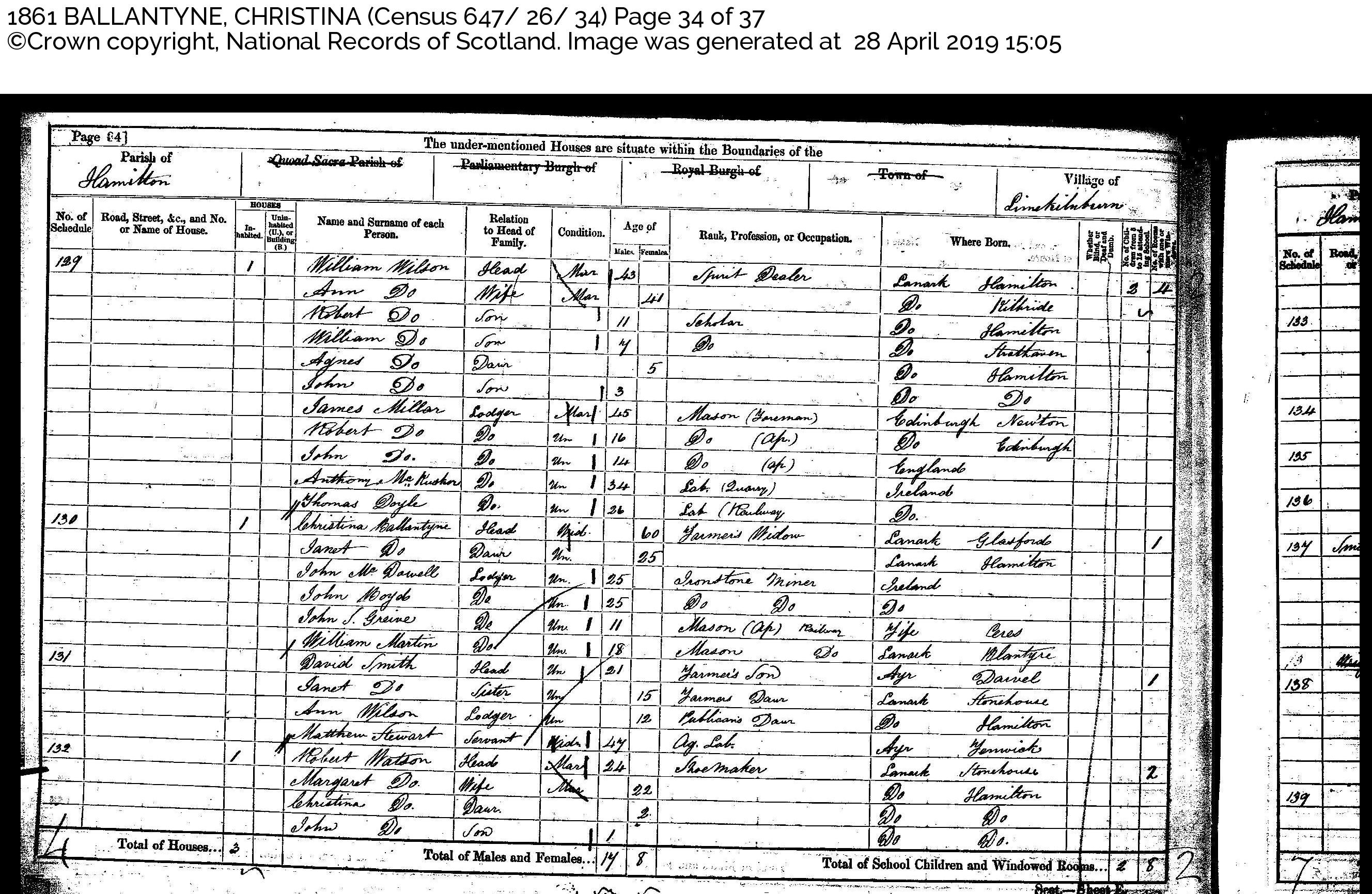 Christina Ballantyne at Hamilton on the 1861 census