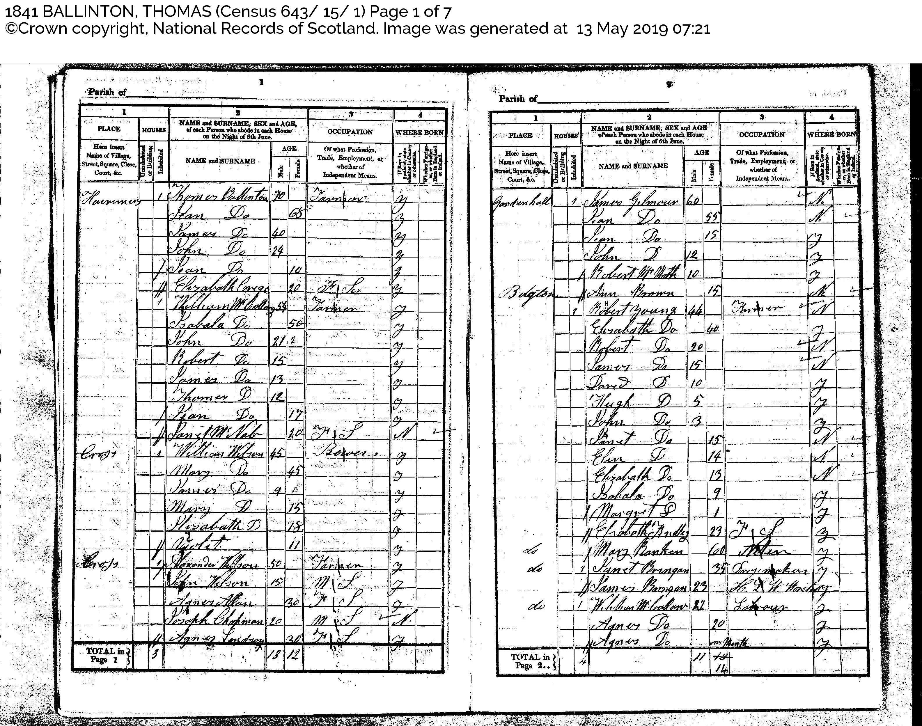 Thomas Ballantyne, 70-year-old farmer, on the 1841 census