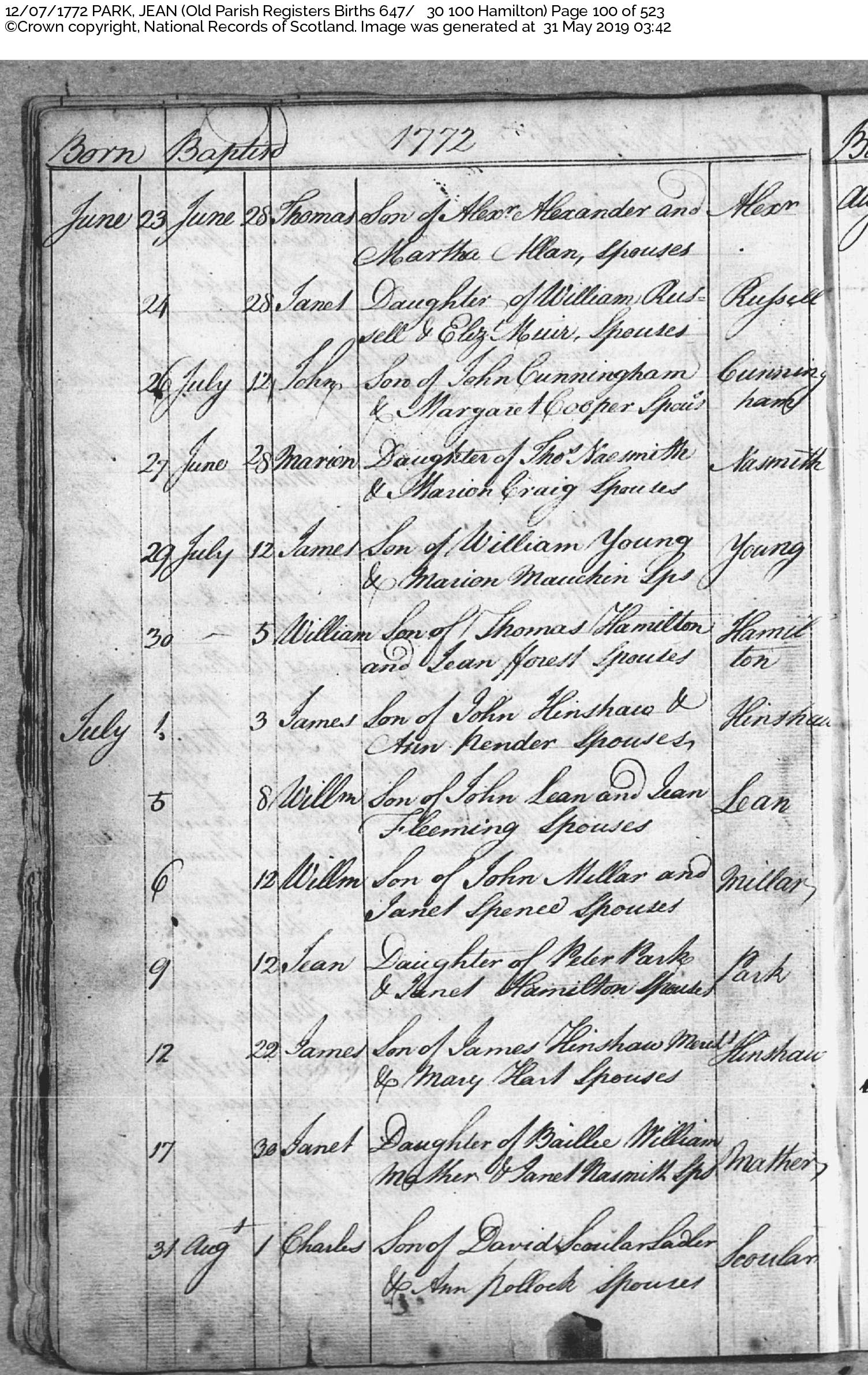 Baptism record for Jean Park at Hamilton, 9 Jul 1772