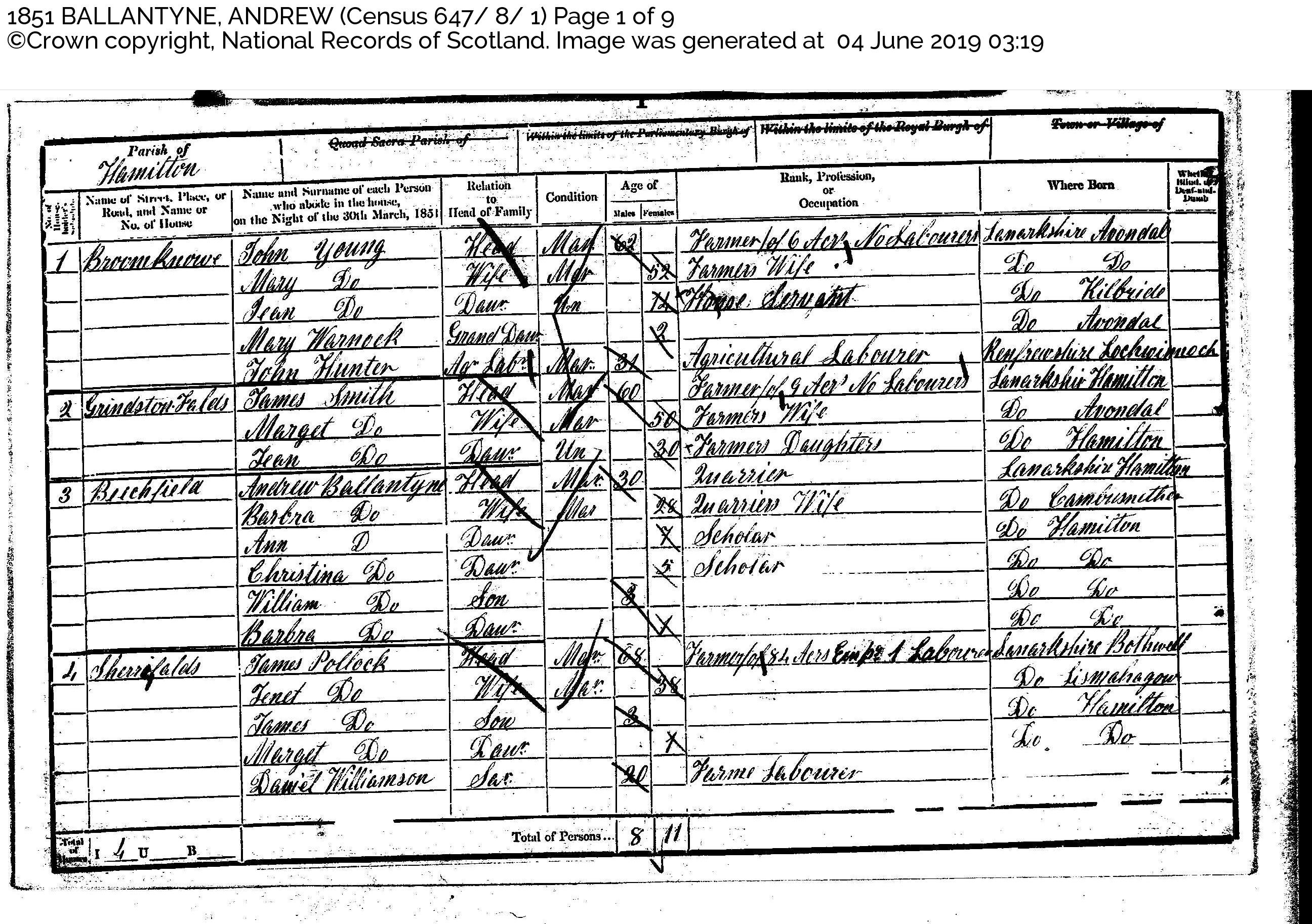 Andrew Ballantyne (quarrier) on the 1851 census at Hamilton (Beechfield)