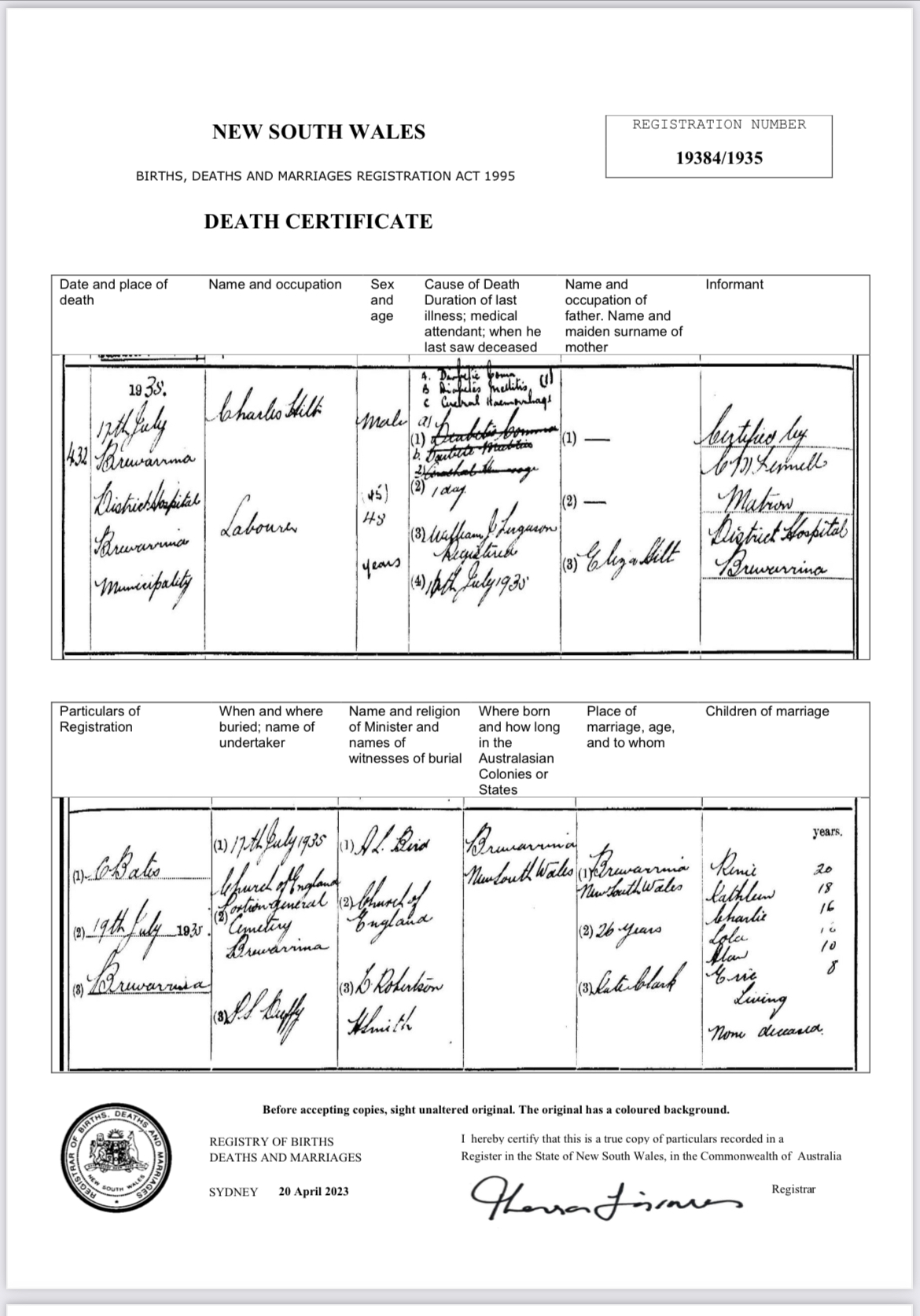 Death Certificate of Charles Hilt, 17 July 1935