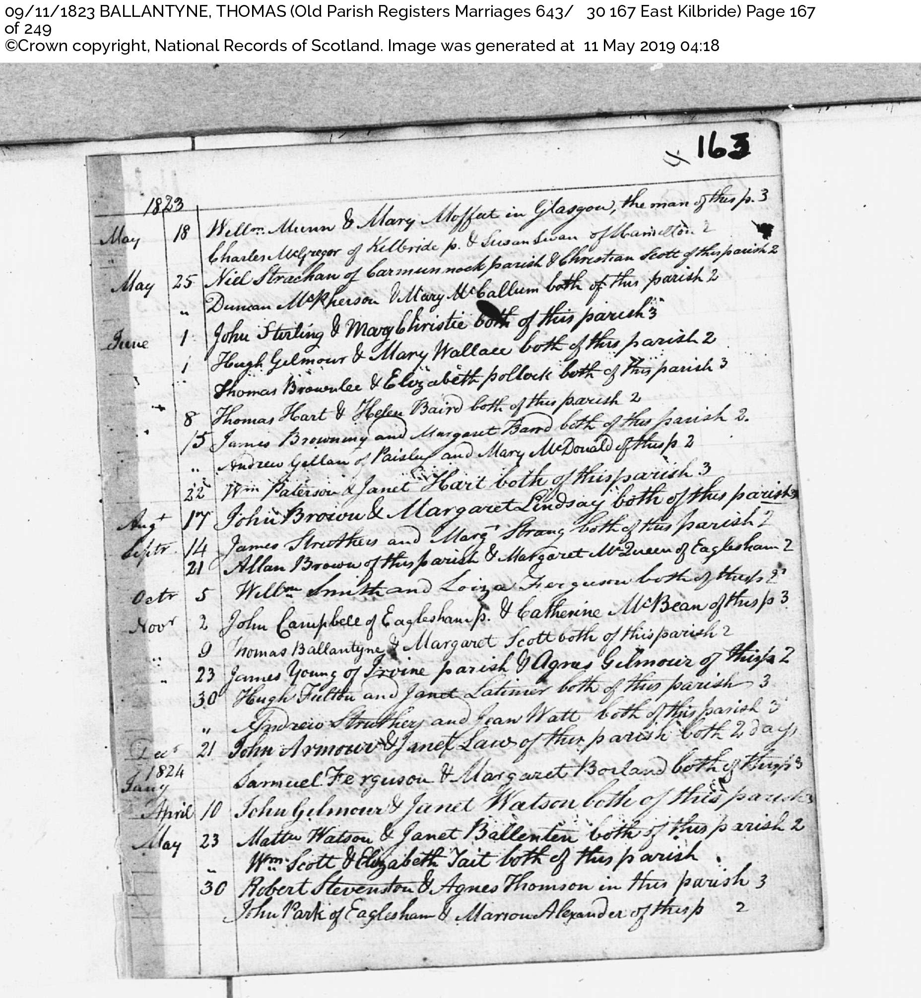 Marriage Record for Ballentyne - Scott, 1823