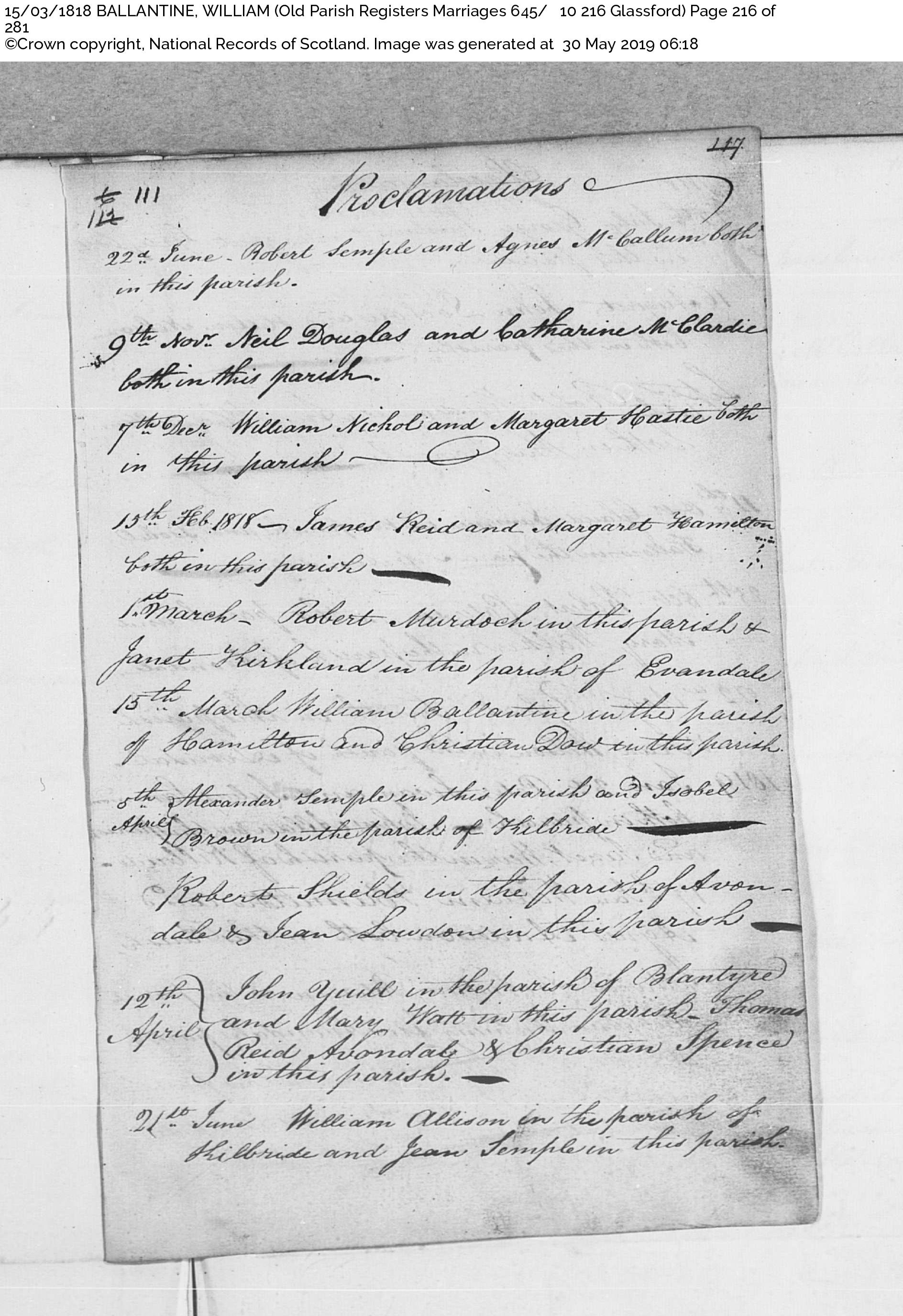 Marriage record for William Ballantyne and Christina Dow, 15 March 1818 at Glassford