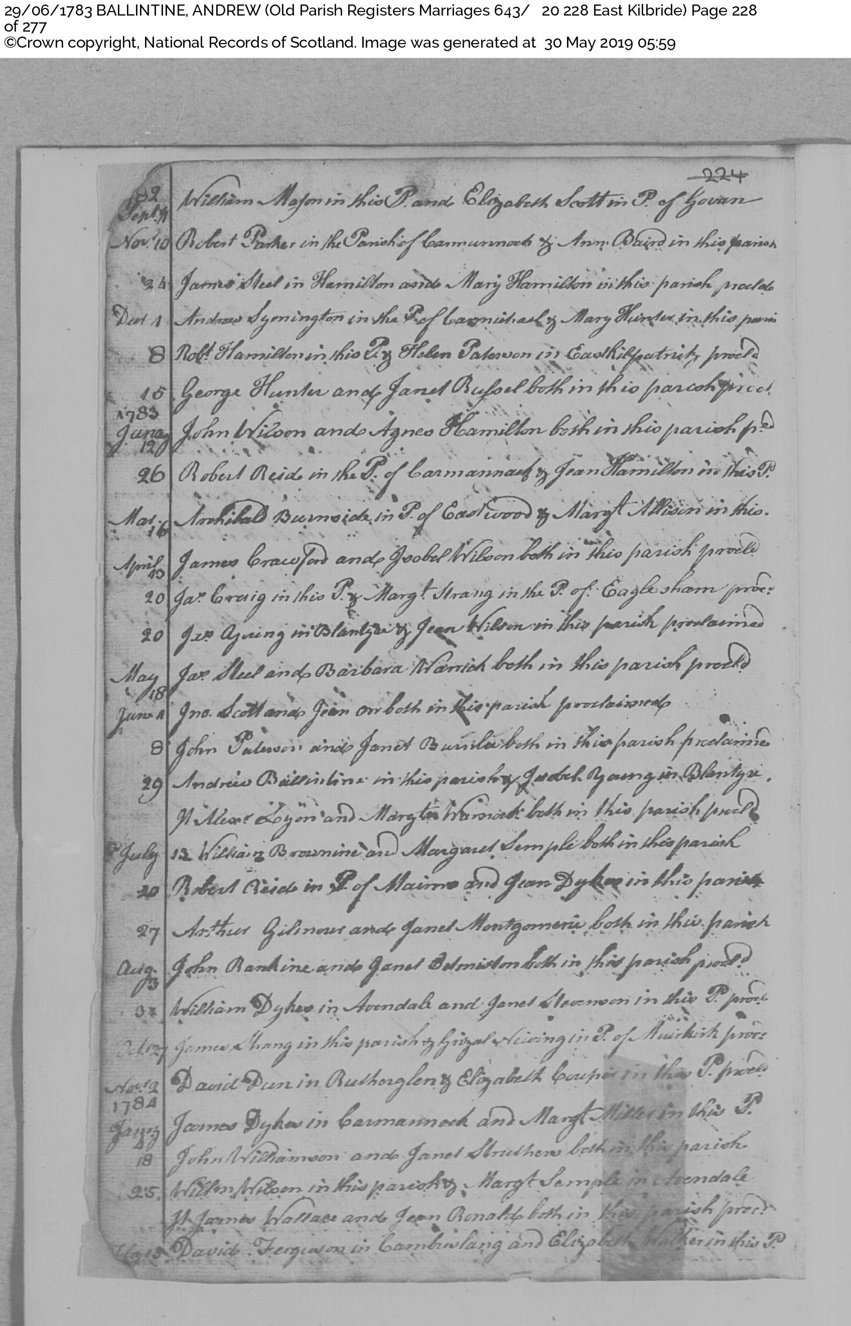 Banns for Andrew Ballantyne and Isobel Young 29 Jun 1783 at East Kilbride