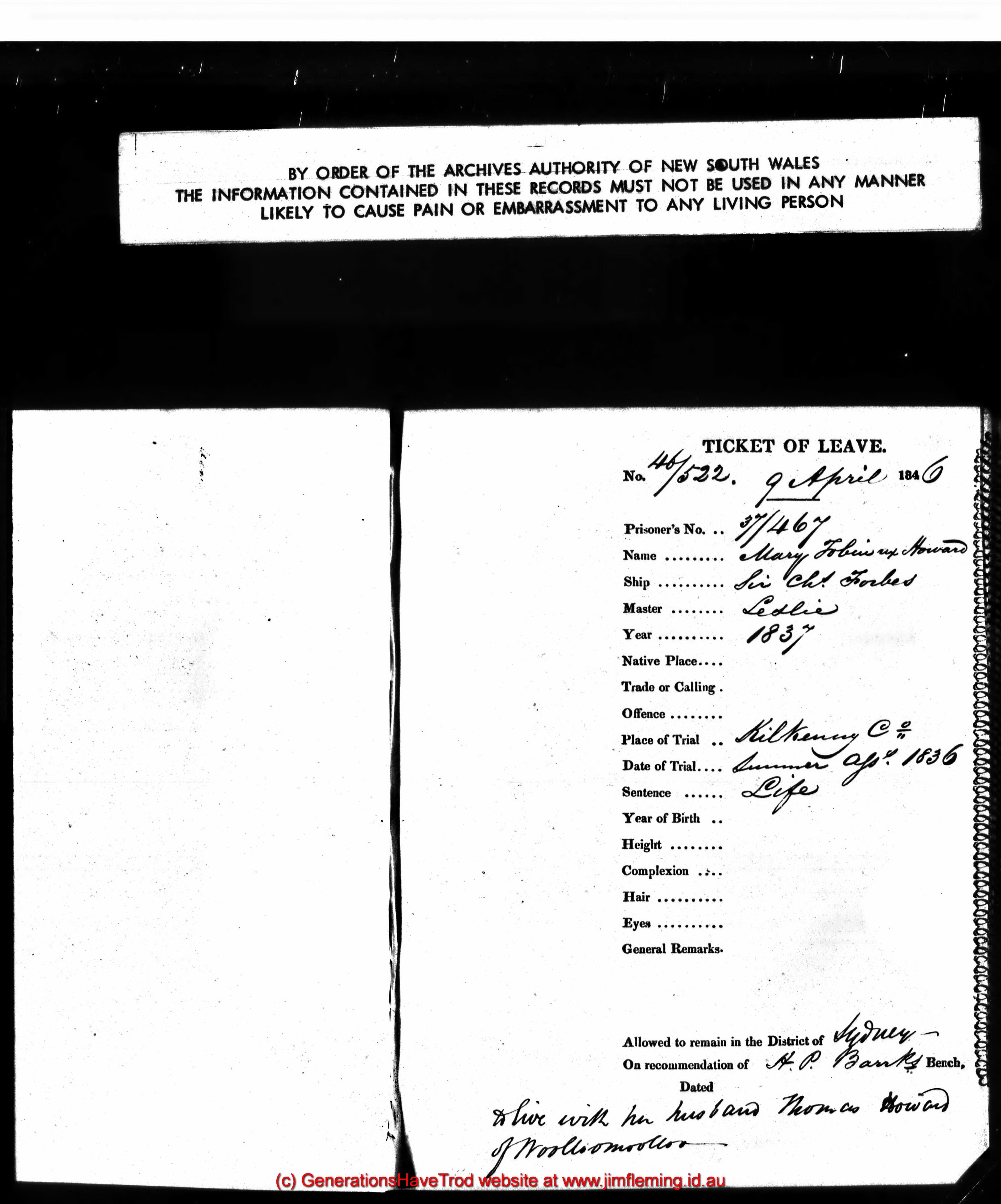 Ticket of Leave Butt copy for Mary Howard nee Tobin 9 Apr 1846